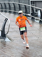 Lorsque je me lance à la course à pied, je vais un peu trop vite et je dois ralentir si je ne veux pas terminer en rampant. Progressivement, je trouve mon rythme et mes pulsations ralentissent à un niveau acceptable. Je suis vraiment impressionné par le rythme que je réussi à maintenir (légèrement supérieur à 5 minutes/ km). Malheureusement pour le classement dans mon groupe d'âge, un autre participant qui court très vite passe devant moi à quelques kilomètres de l’arrivée!